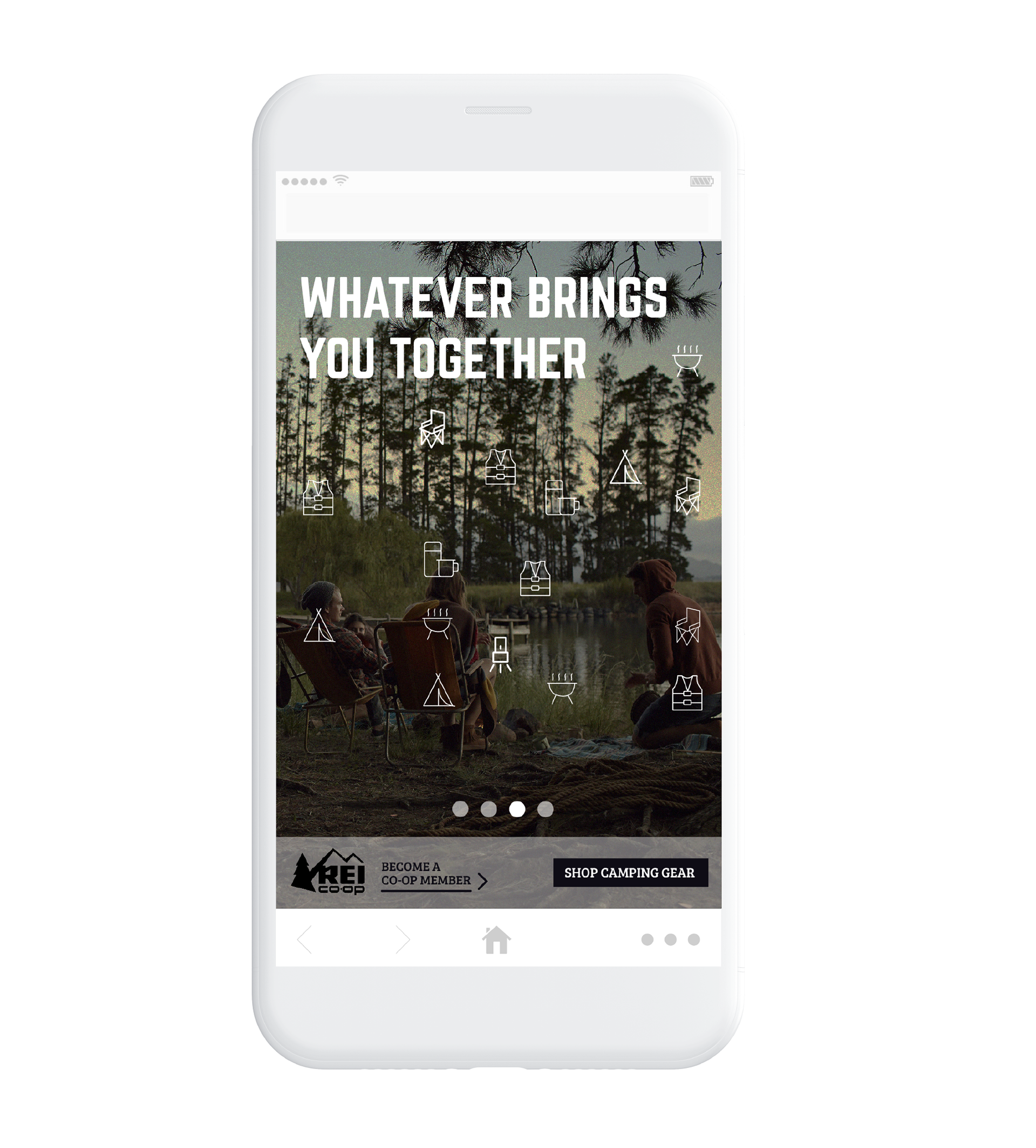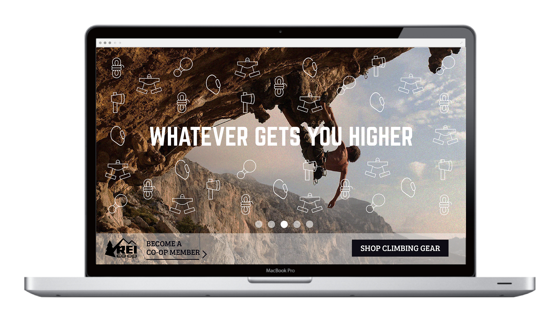 The design solution focused on the quality and customer loyalty that is integral to REI's brand. The tag-lines emphasize how REI is not just a store with products, but a means to create new passions and adventures. The photography was chosen to add context and maintain the brand's adventurous aesthetic and muted color palette, and the icons were included to represent the specific products REI offers to help the customer achieve their goals.